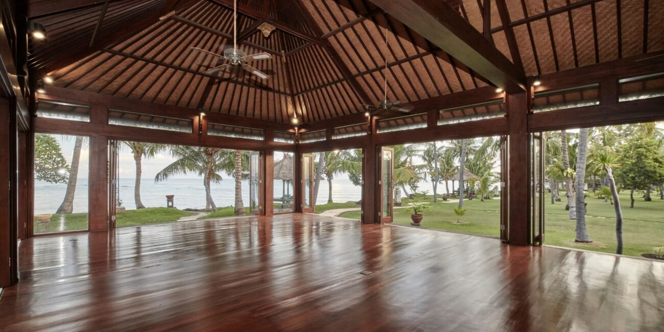 Maharani Shala Pavilion is a spacious and harmonious venue, covering around 133 square meters. This shala is rectangular in shape, providing a focused and structured environment. The open-air structure is surrounded by panoramic views of the lush tropical landscape, allowing participants to immerse themselves in nature. The shape of the shala, coupled with its high ceiling and wooden floors, creates a warm and expansive environment, perfect for larger group sessions. Maharani Shala Pavilion is ideal for gatherings, workshops, retreat meetings, graduation ceremonies, online & offline yoga class productions, and seminars, comfortably accommodating up to 35 participants.